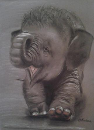 jeune éléphant - fusain et craie blanche rehaussé de sanguine sur papier gris. format Raisin (50 x 60 cm)